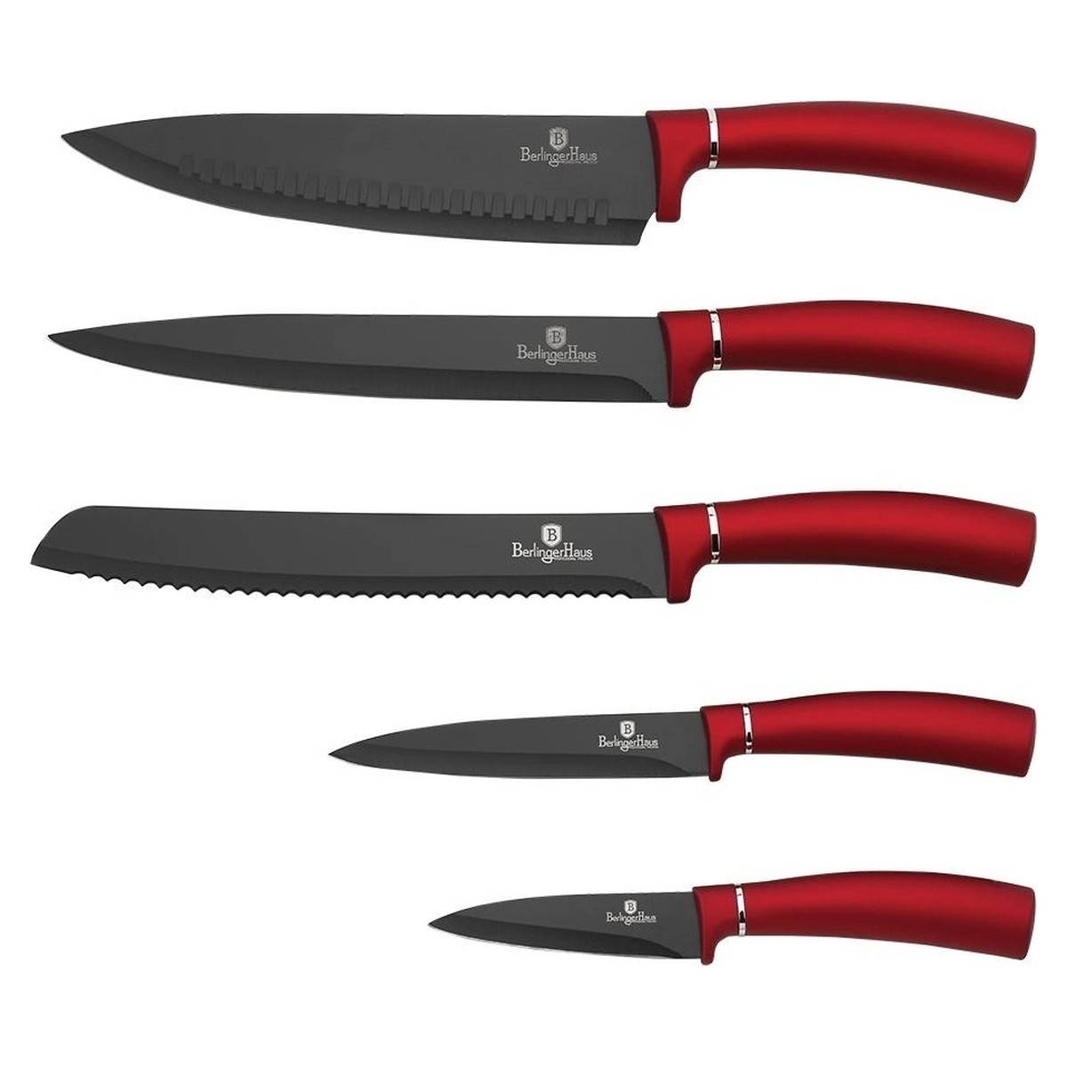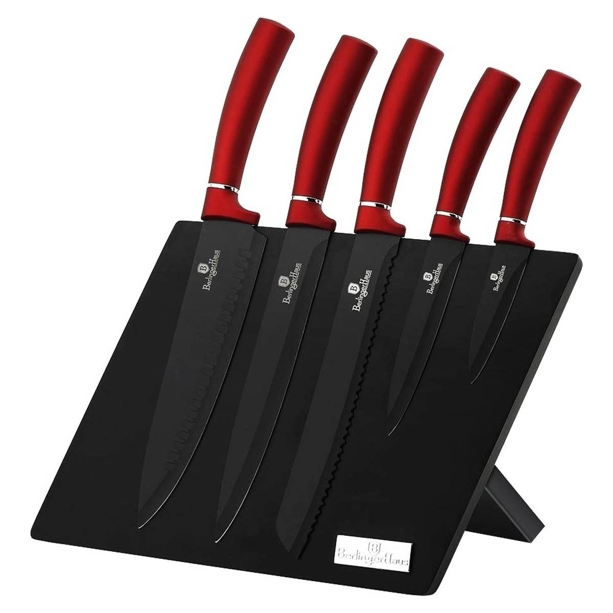 Sada nejpoužívanějších kuchyňských nožů z oblíbené kolekce Burgundy Metallic Line v kombinaci černé a červené barvy. Navíc s praktickým designovým magnetickým stojanem, na kterém budou nože vždy přehledně uskladněny. Čepele jsou z nerezové oceli, potažené antibakteriálním povrchem Diamond. Tento povrch je nepřilnavý, takže se připravované potraviny na nože nelepí, navíc funguje jako ochrana čepelí. Také nepřenáší pachy krájených potravin, neničí vitamíny v nich a nezůstávají na něm skvrny. To je výhodné především při krájení různých druhů potravin, nože mezitím stačí jen opláchnout ve vodě. Rukojeti se speciální úpravou SoftTouch jsou měkčené a tím zajistí spolehlivý, pevný úchop. Navíc jsou ergonomicky tvarované a protiskluzové, takže nekloužou i když máte třeba mokrou ruku. Nepřilnavé nože lze brousit standartně ocílkou, brouskem nebo na brusném kameni, stejně jako jste zvyklí u klasických nožů.
