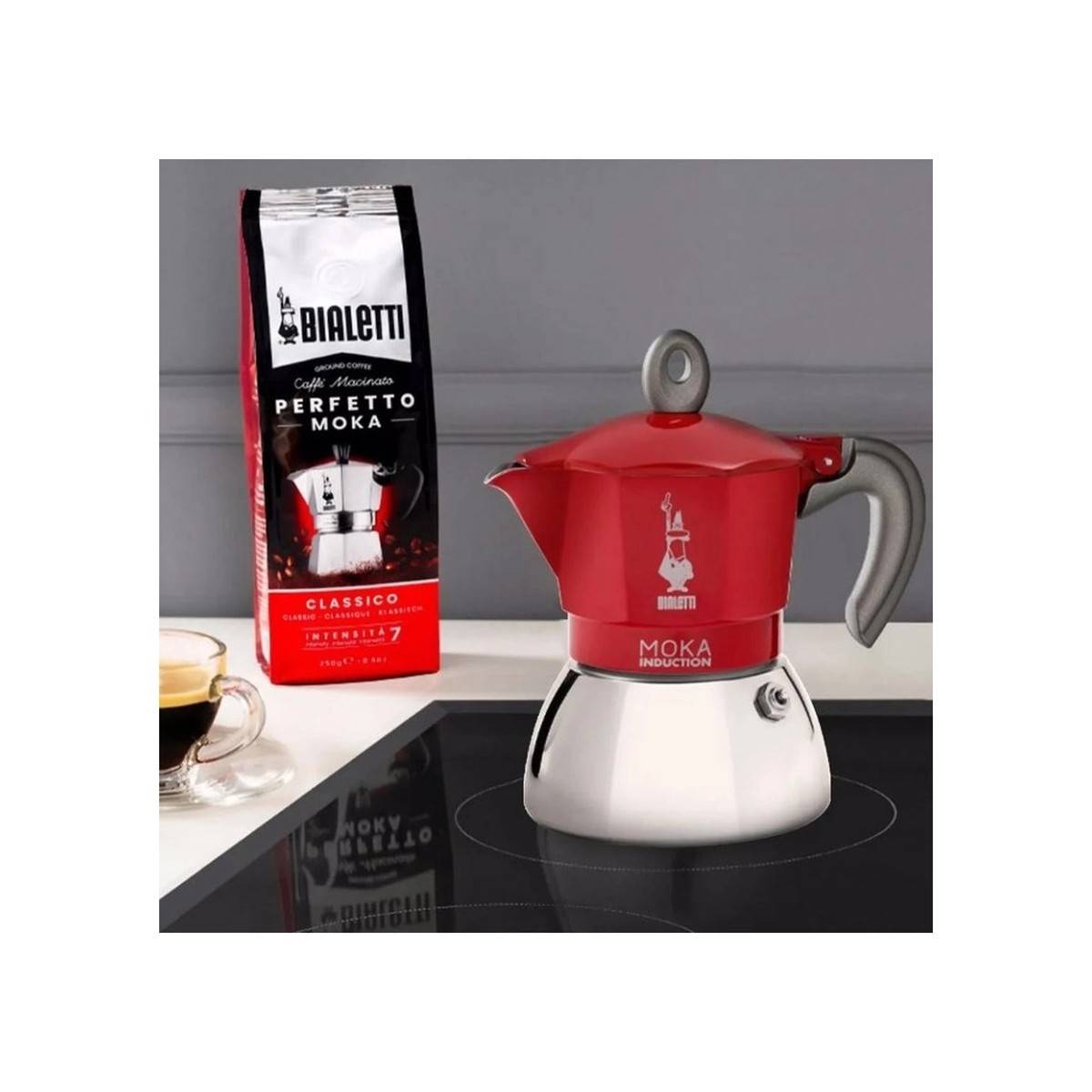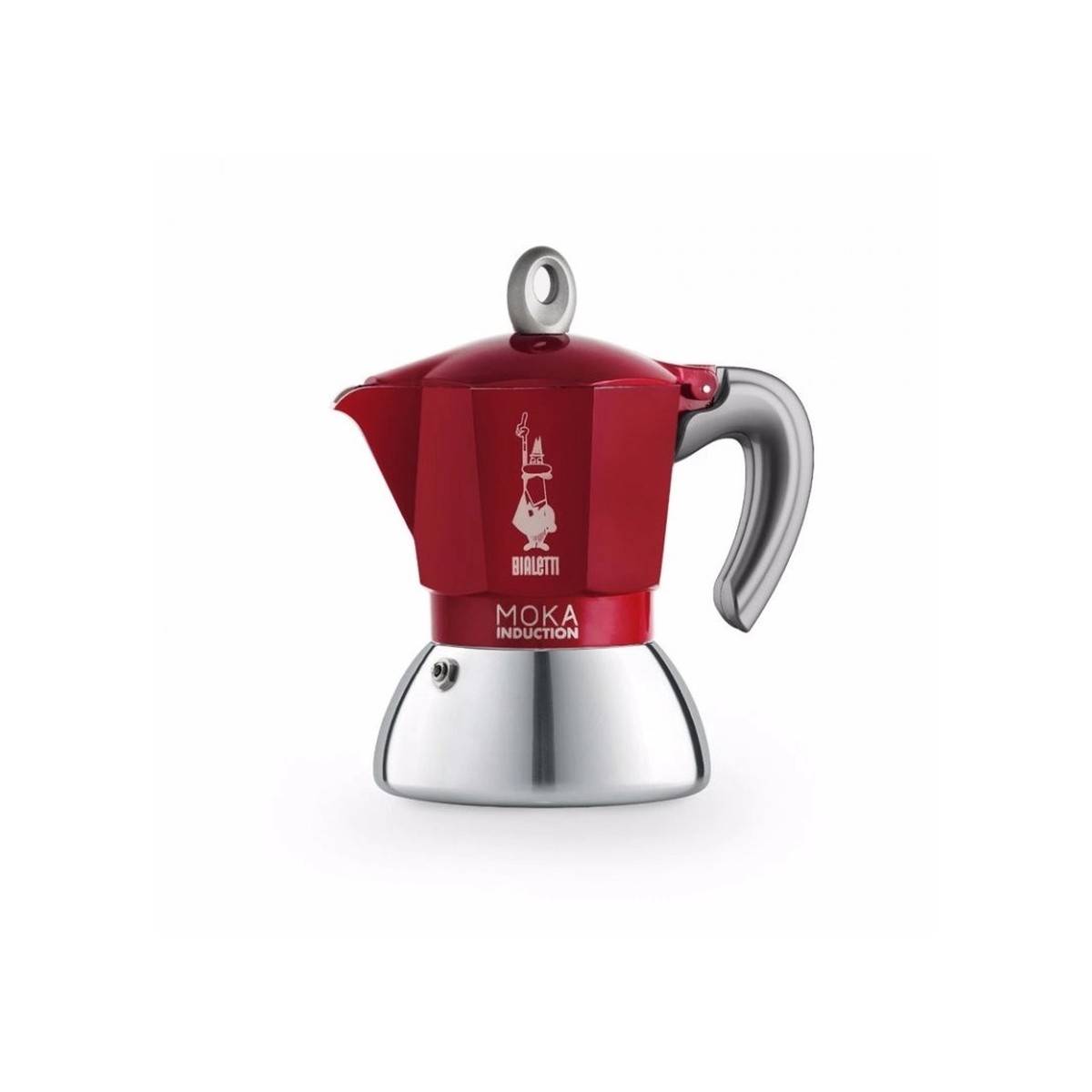 - Červený moka kávovar New Moka Induction na přípravu čtyř tradičních italských šálků espressa.