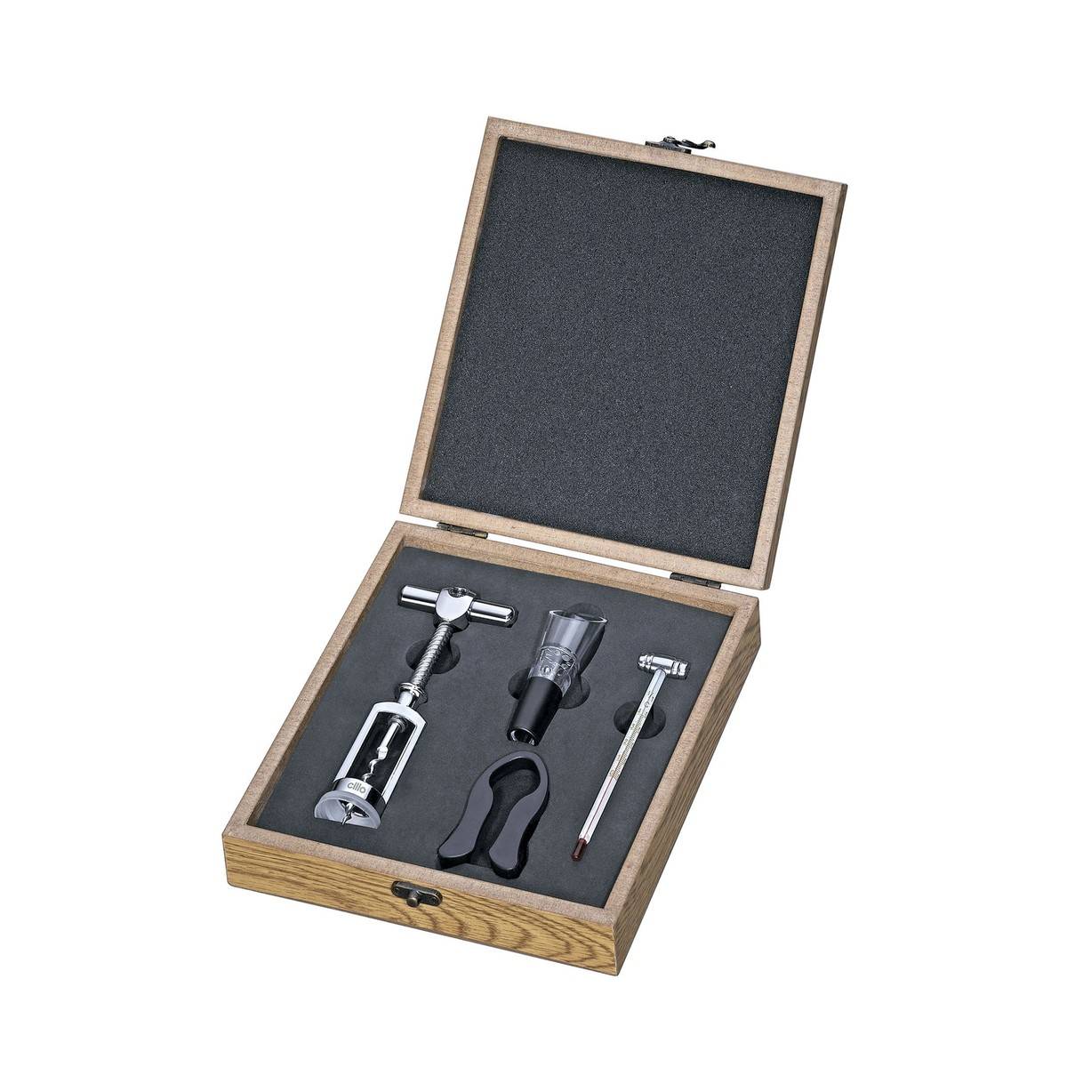 - Sada zahrnuje: vývrtku, nalévací nástavec, ořezávač fólie a teploměr.