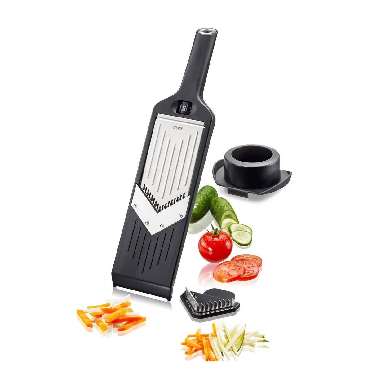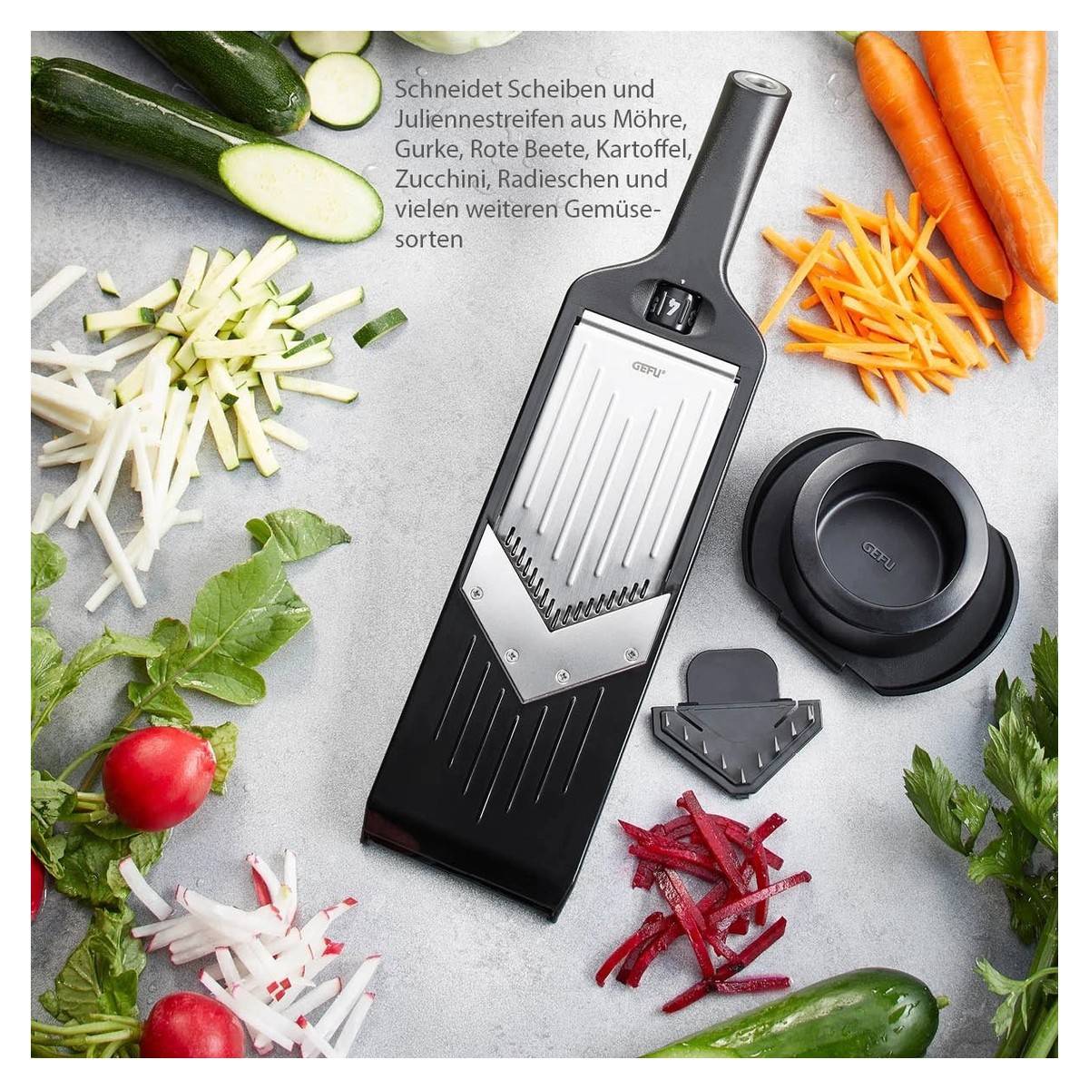 - Jednoduchým otočením si plynule nastavíte tloušťku plátků (1-5 mm) nebo dva typy nudliček julienne (3 a 6 mm).