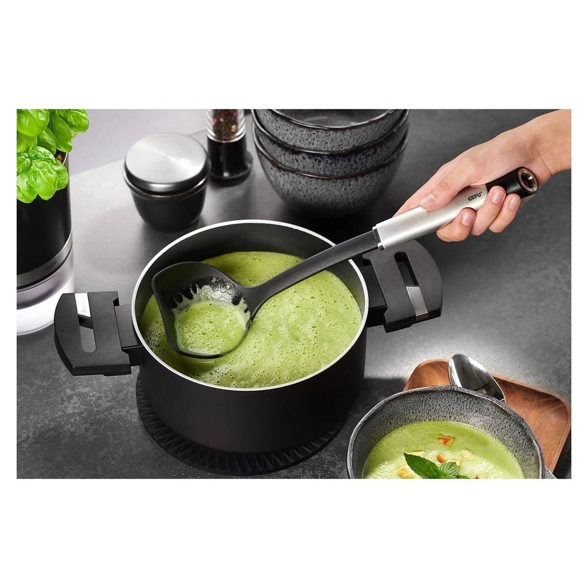 - Chytrý zkosený tvar lžíce usnadňuje nabírání a zaručuje servírování bez kapek.