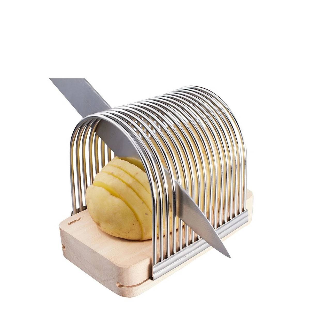 - Díky vyvýšeným okrajům nikdy neproříznete bramboru úplně, takže se vám vějířky vždy povedou.