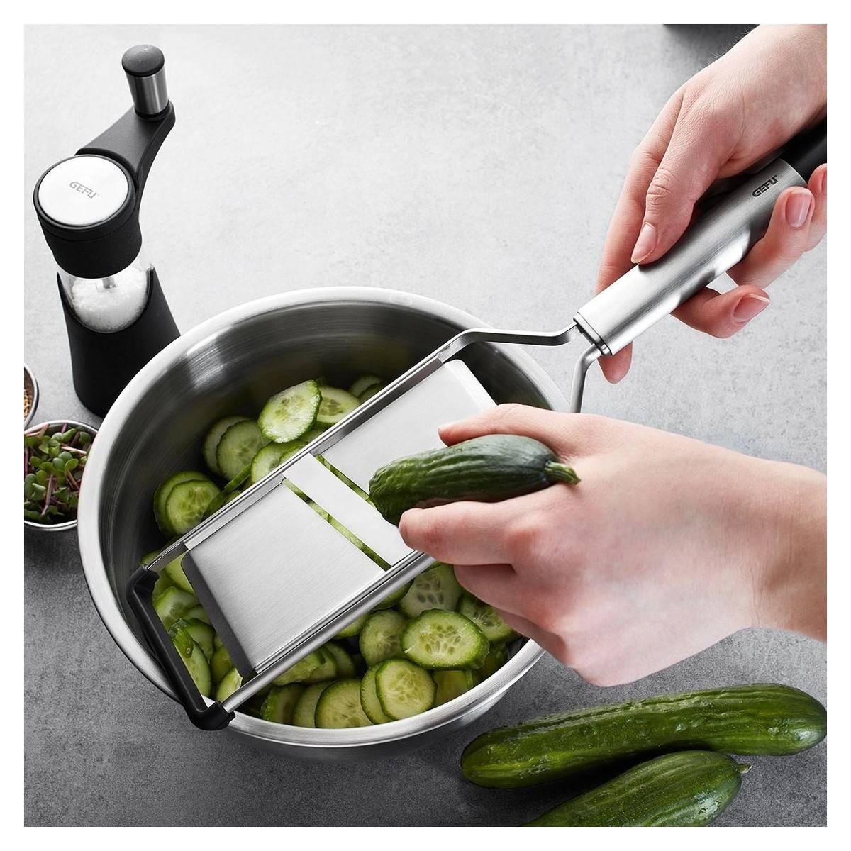 - Ostrá čepel si hravě poradí s bramborami, okurkami, cibulí i jablky.