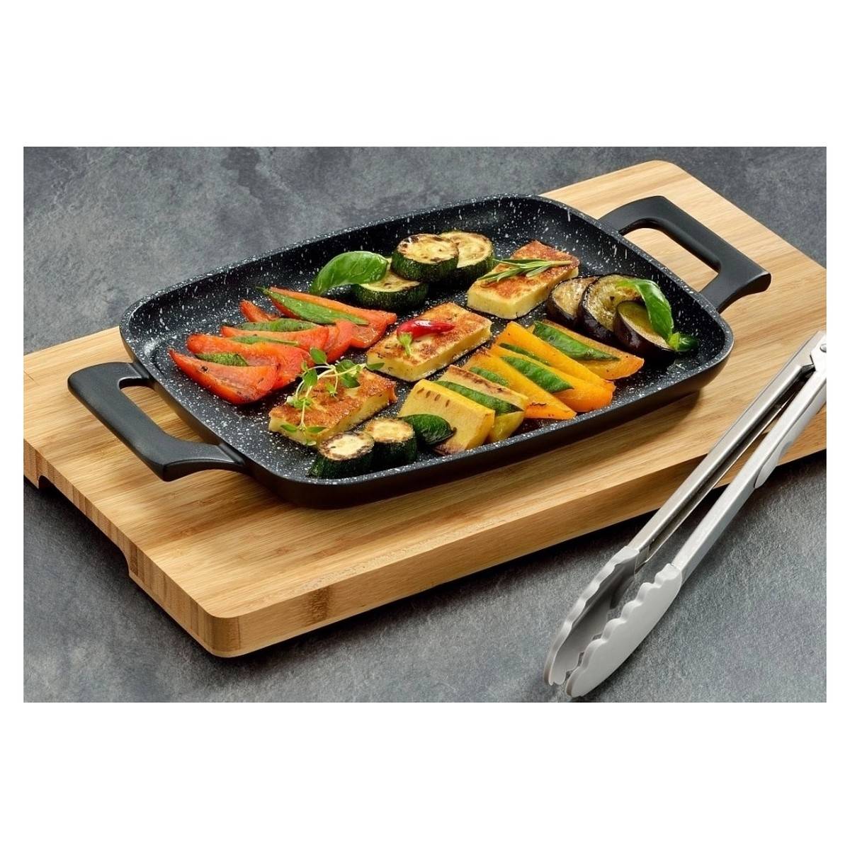 - grilovací deska je ideální k přípravě zeleniny, masa, uzenin, steaků, burgerů nebo ryb, následně lze jakékoliv suroviny zapékat v troubě a připravit tak celý oběd nebo večeři na jednom kusu nádobí