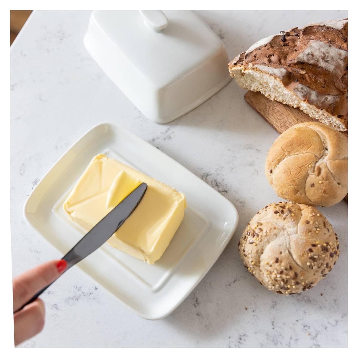- Díky ní můžete máslo skladovat mimo lednici, kde zůstane čerstvé a snadno roztíratelné.