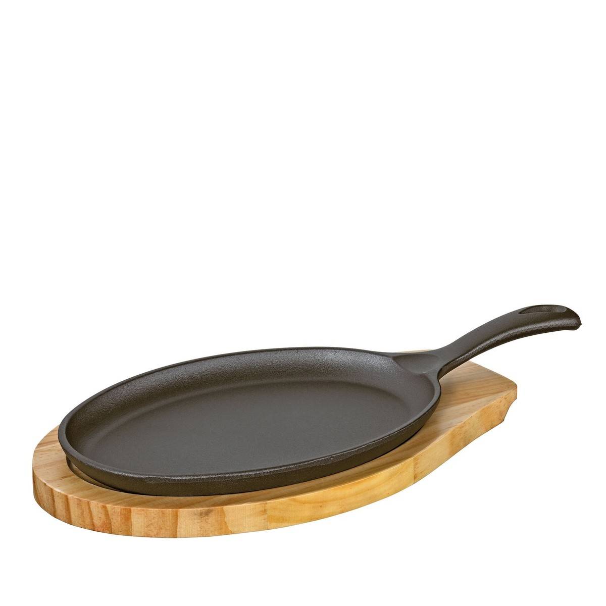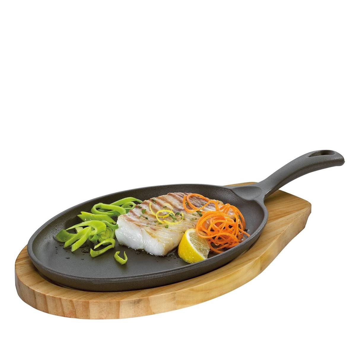 - Díky dřevěnému prkénku lze pánev stylově a bezpečně servírovat přímo na stůl, pánev je pevně usazena v připraveném výřezu.