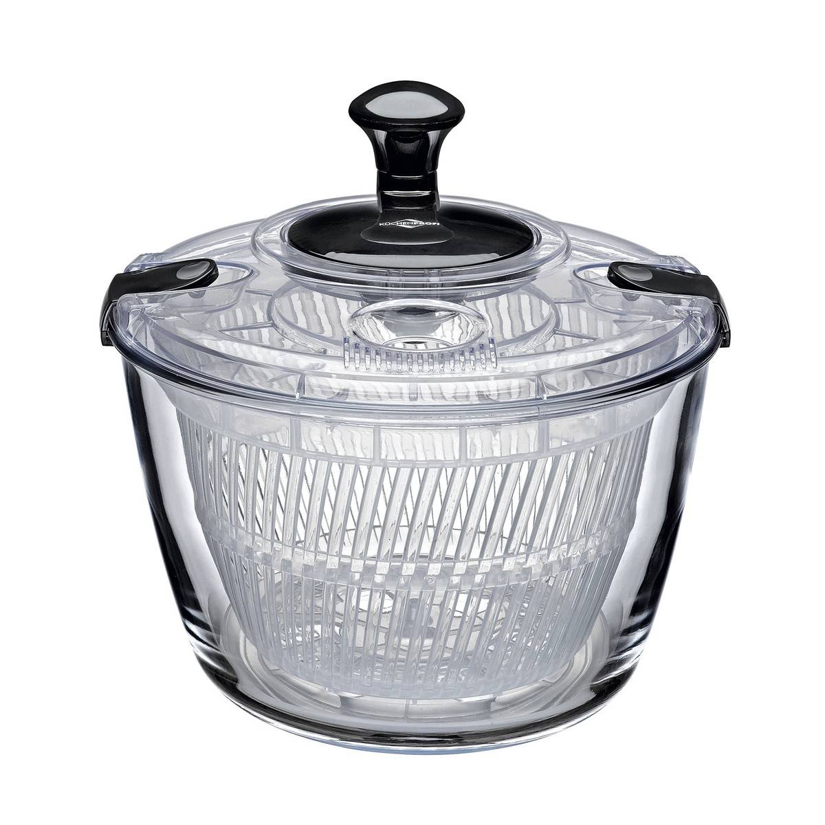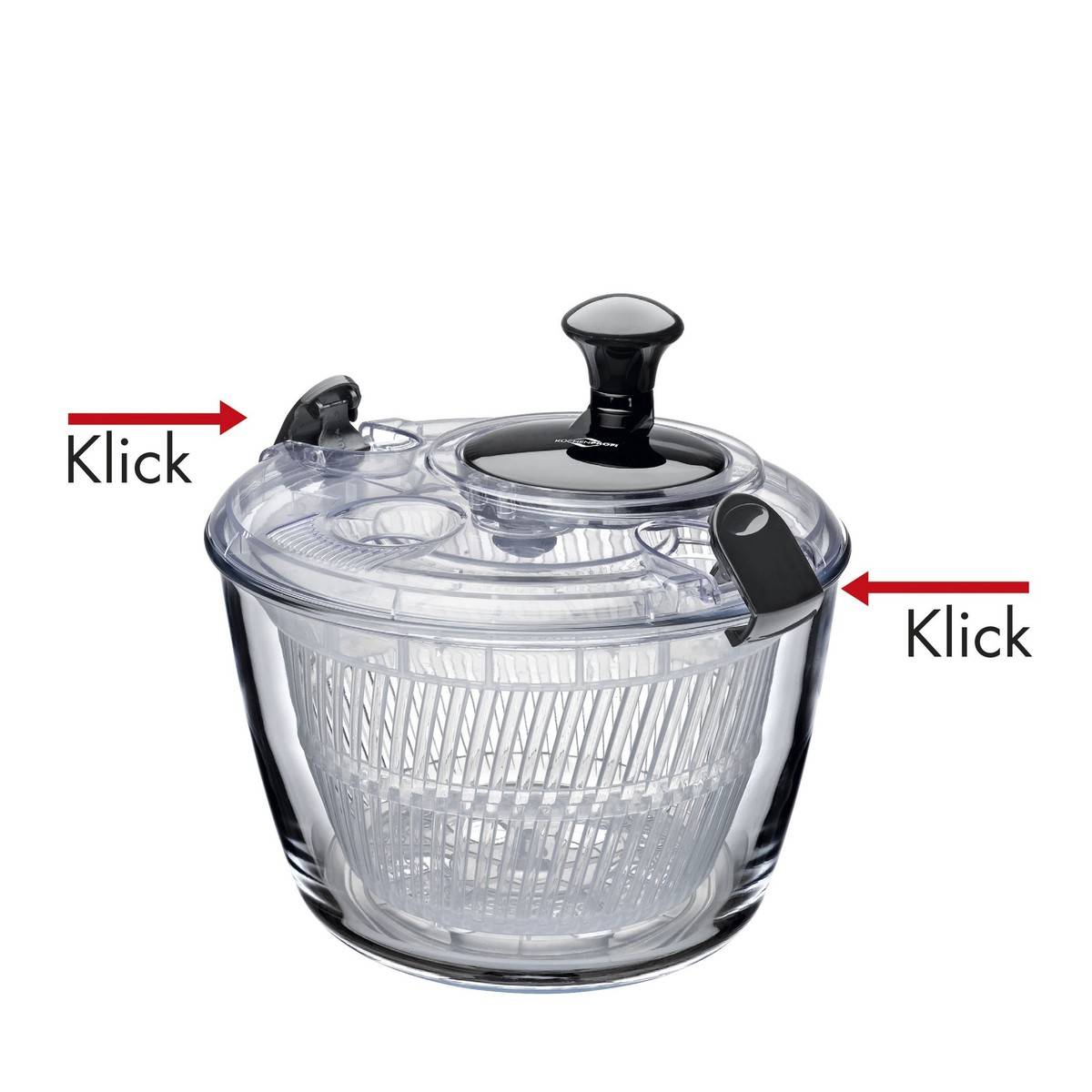 - Jednoduché použití: Vložte čerstvě omytý salát do košíku, umístěte jej do mísy, nasaďte víko a otáčením kliky salát šetrně osušte.