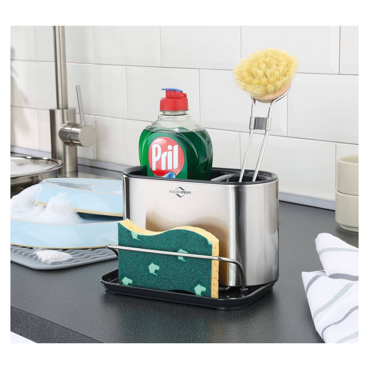 - Oddělené přihrádky na láhev saponátu a mycí kartáč