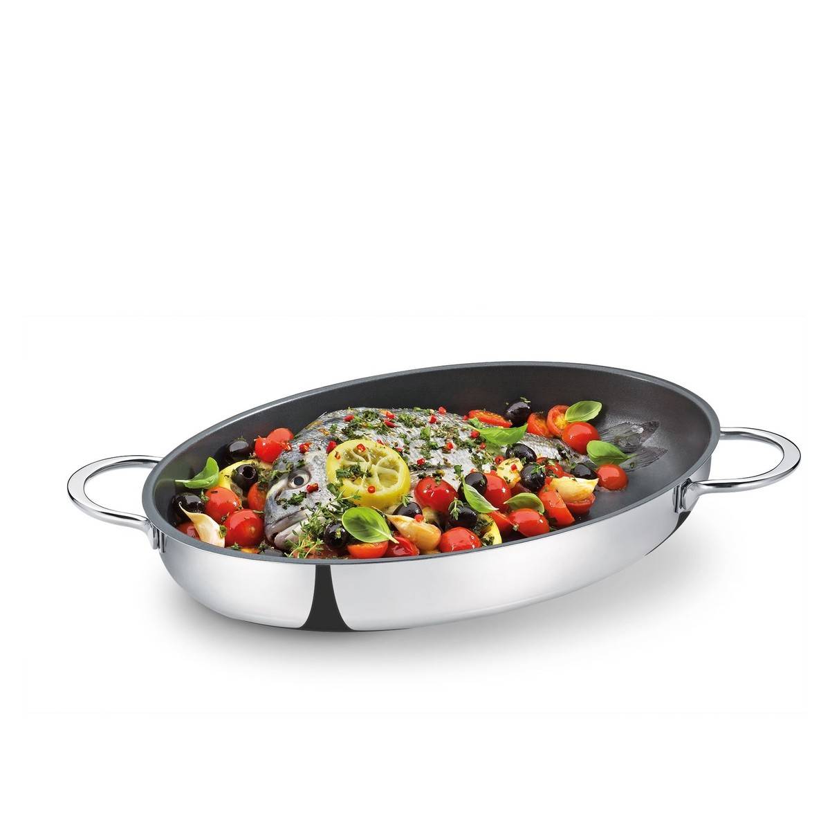 - Oválný tvar poskytuje dostatek prostoru pro přípravu ryb, masa či zeleninových špízů