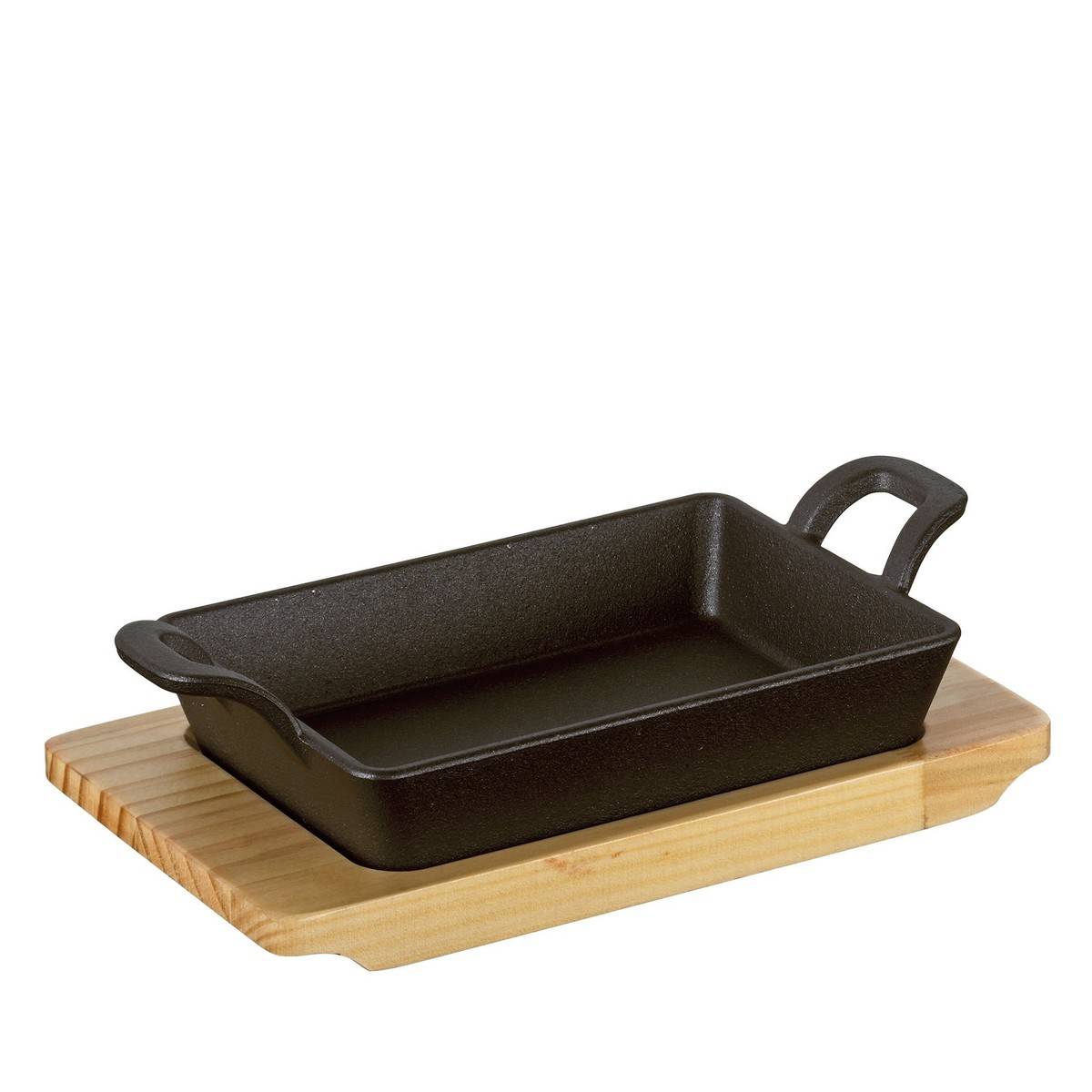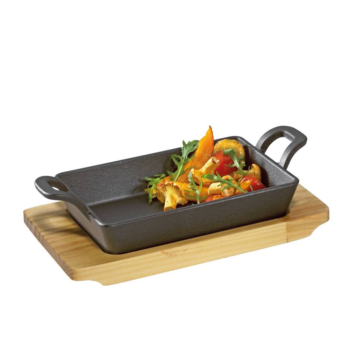 - Díky dřevěné podložce z borovicového dřeva je možné pánev stylově a bezpečně servírovat přímo na stole, kde bezpečně drží ve svém vybrání.