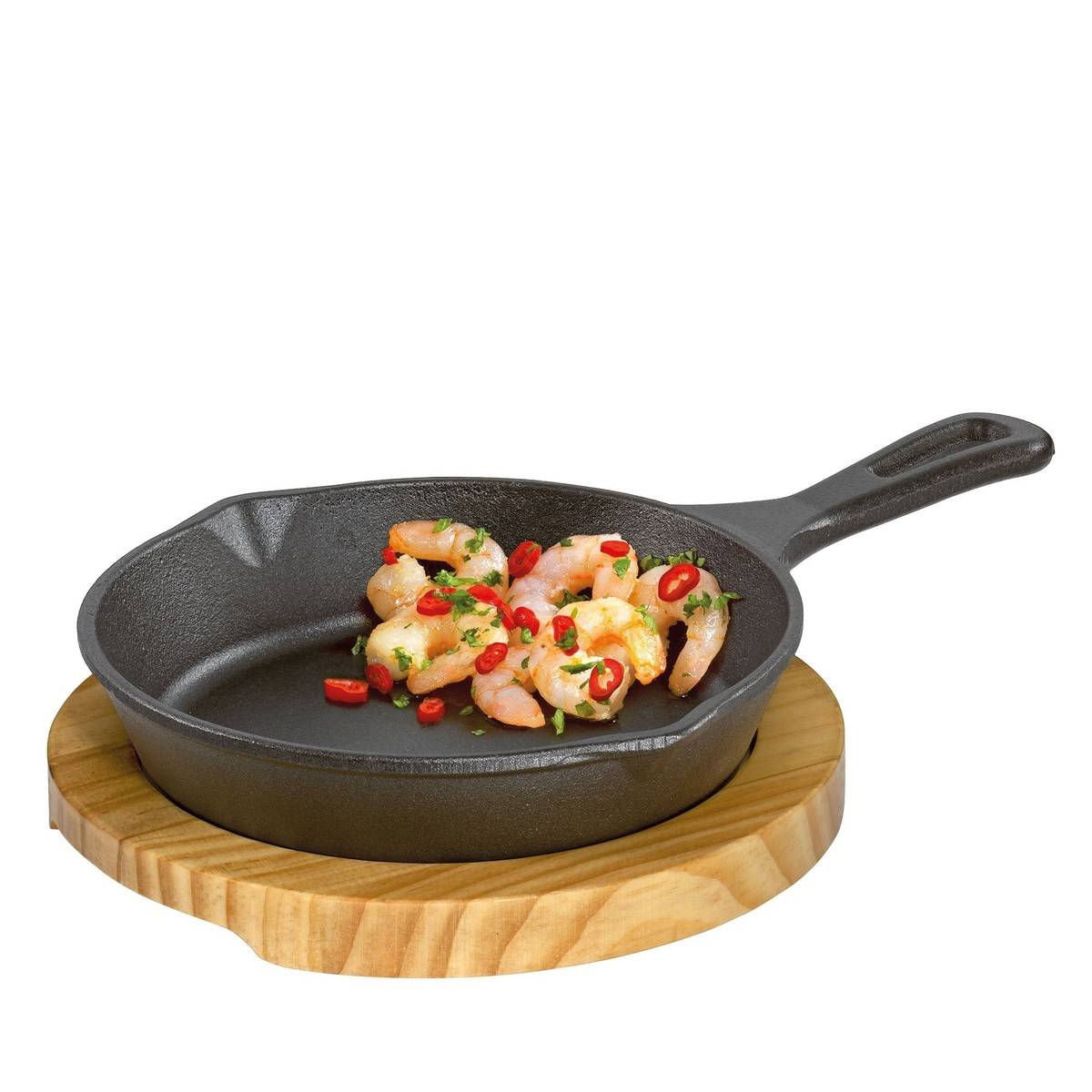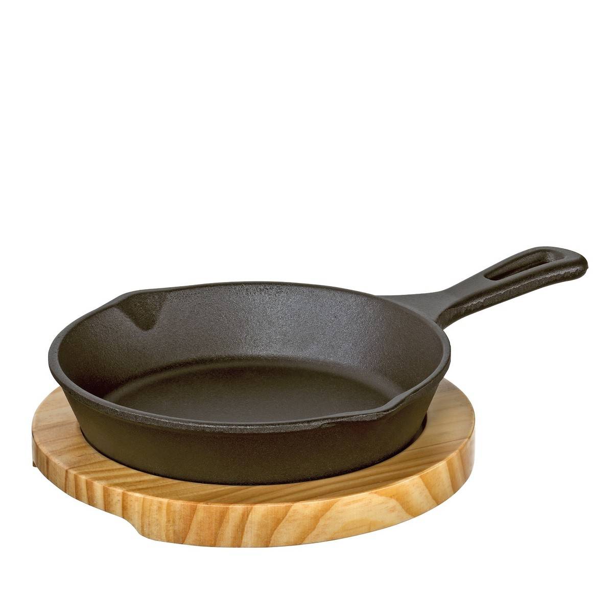 - Díky dřevěné podložce z borovice lze pánev stylově a bezpečně servírovat přímo na stůl – pánev je stabilně usazena v prohlubni.