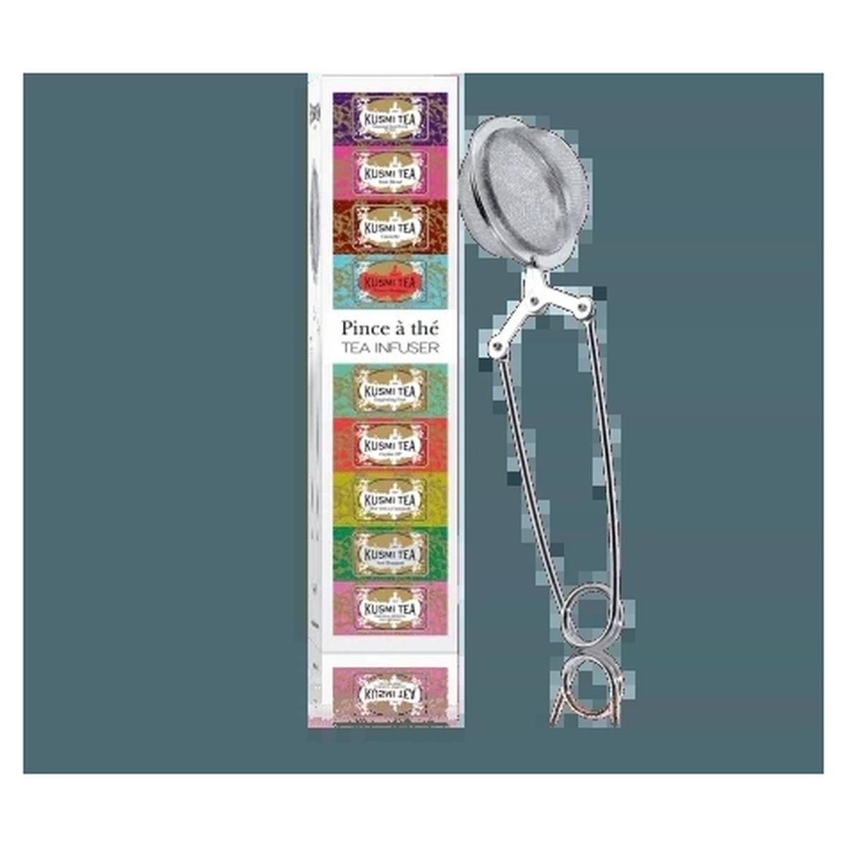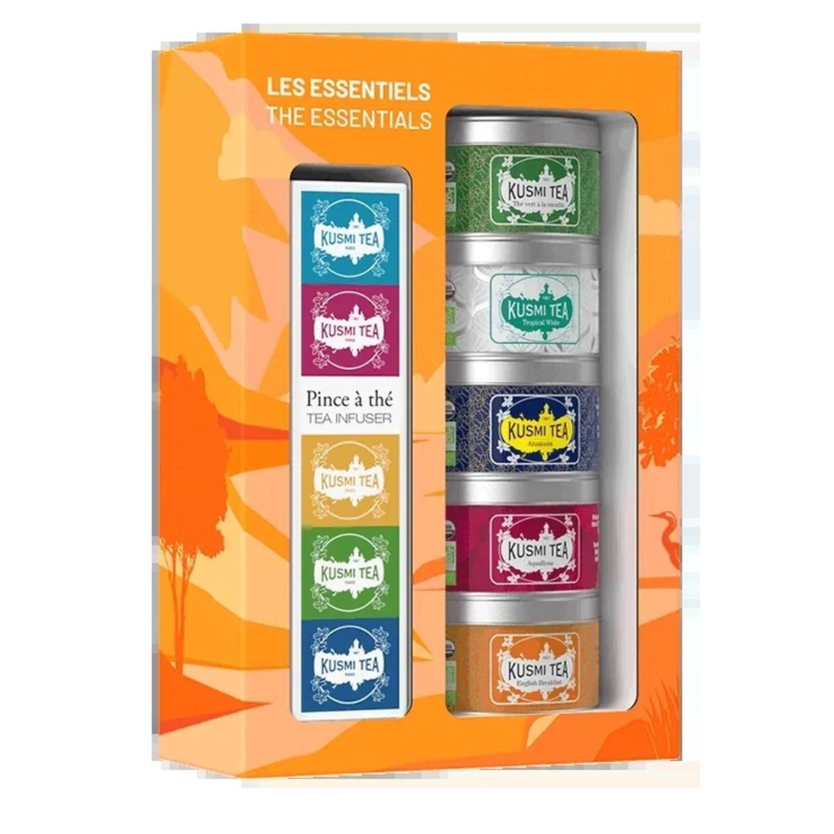 Dárková sada Kusmi Tea Essentials Teas obsahuje 5 nejoblíbenějších čajů od Kusmi Tea. Sypané čaje jsou organického původu a každá z malých kovových dóz obsahuje 20 g čaje. Součástí balení je i čajové sítko typu "kleště". Ideální dárek pro milovníky kvalitních čajů.