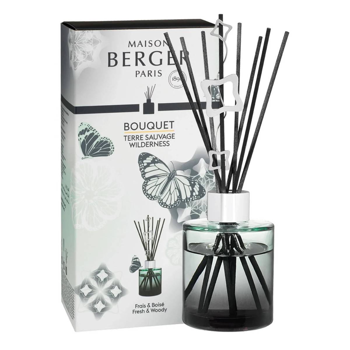 Dárkový set obsahuje zelený aroma difuzér Lilly francouzské značky Maison Berger Paris již naplněný 115 ml interiérového parfému s vůní Divočina a 8 kusů polymerových vonných tyčinek.