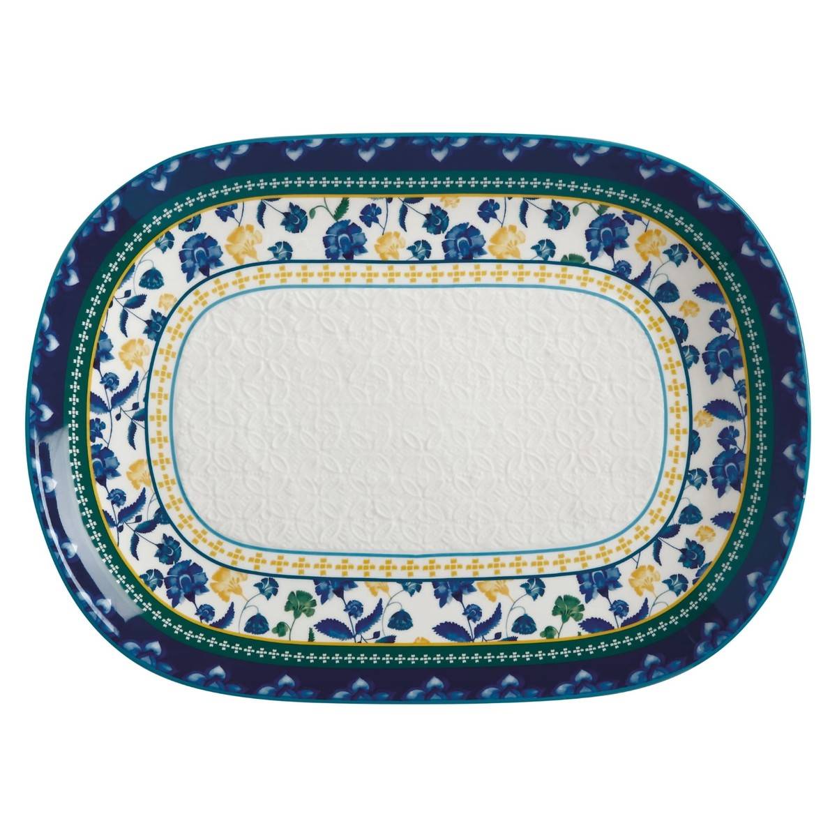 - White with blue/yellow print