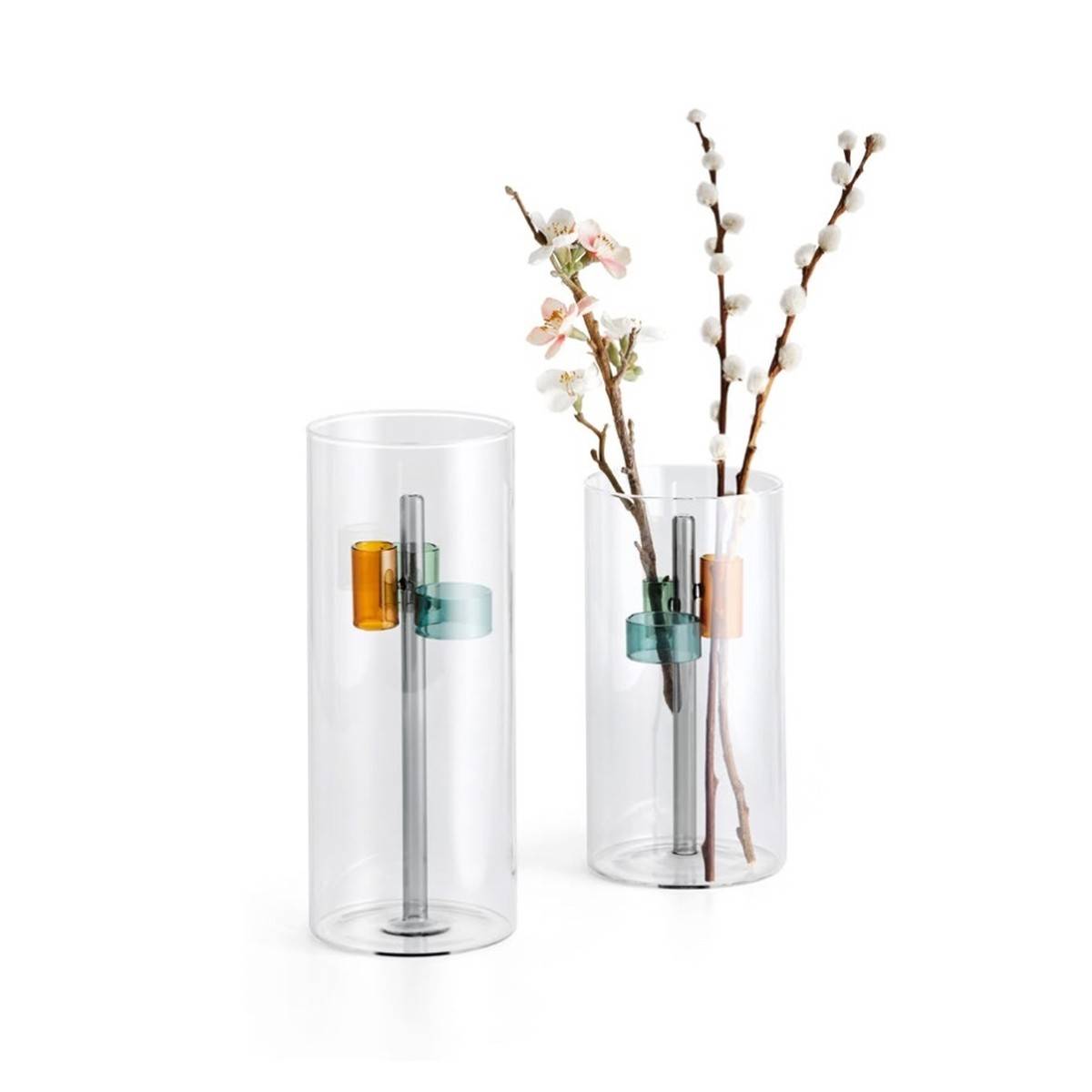 - Decentní barevné skleněné prstence uvnitř vázy působí svěžím a lehkým dojmem.