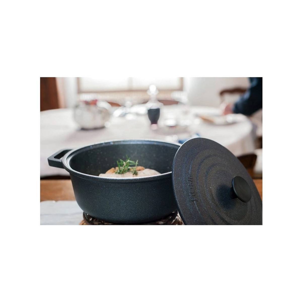 - Víko z litého hliníku pomáhá uchovávat vlhkost a šťavnatost připravovaných pokrmů, zachovává nutriční hodnoty.