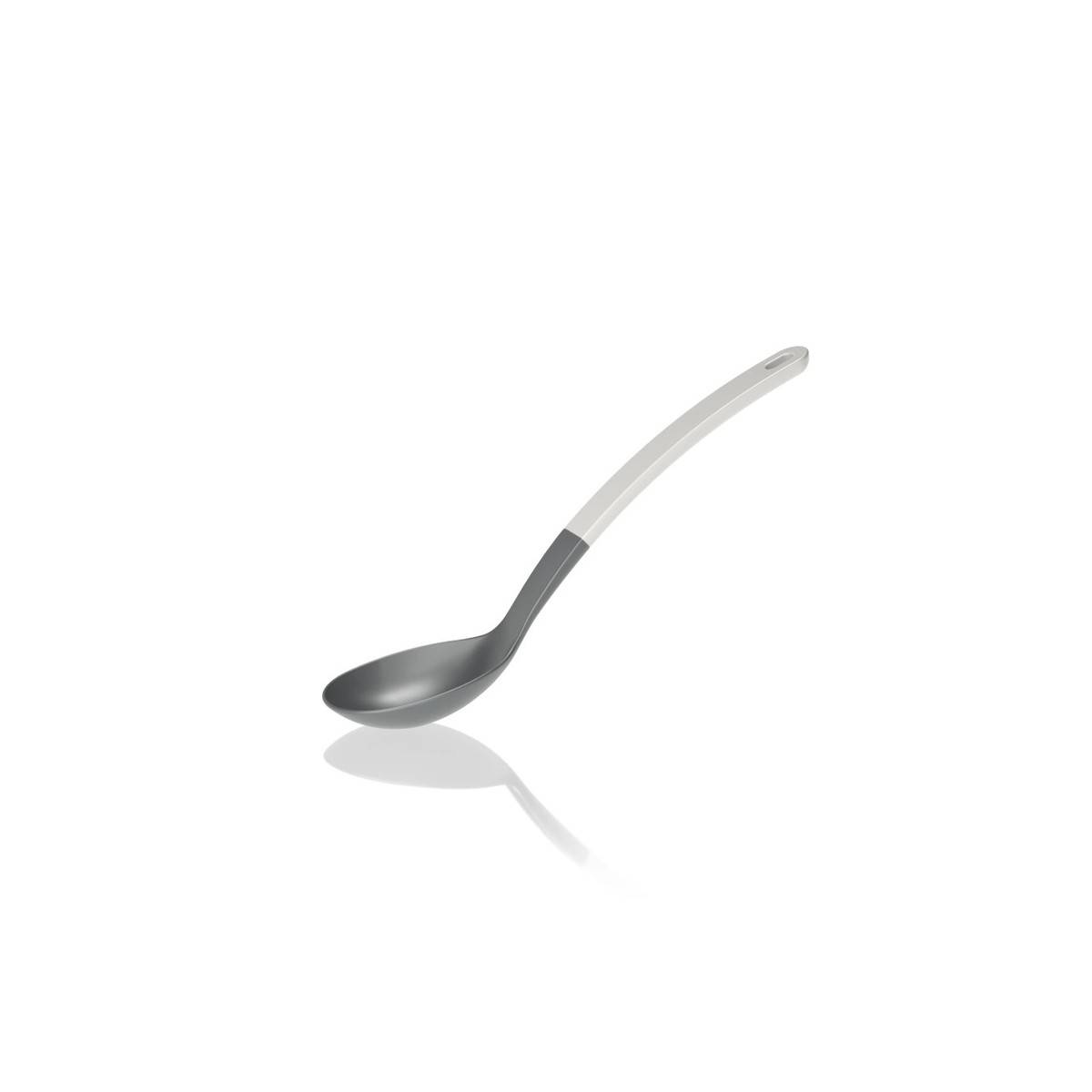 - Bílá servírovací lžíce o délce 29 cm s barevnou ergonomickou rukojetí.