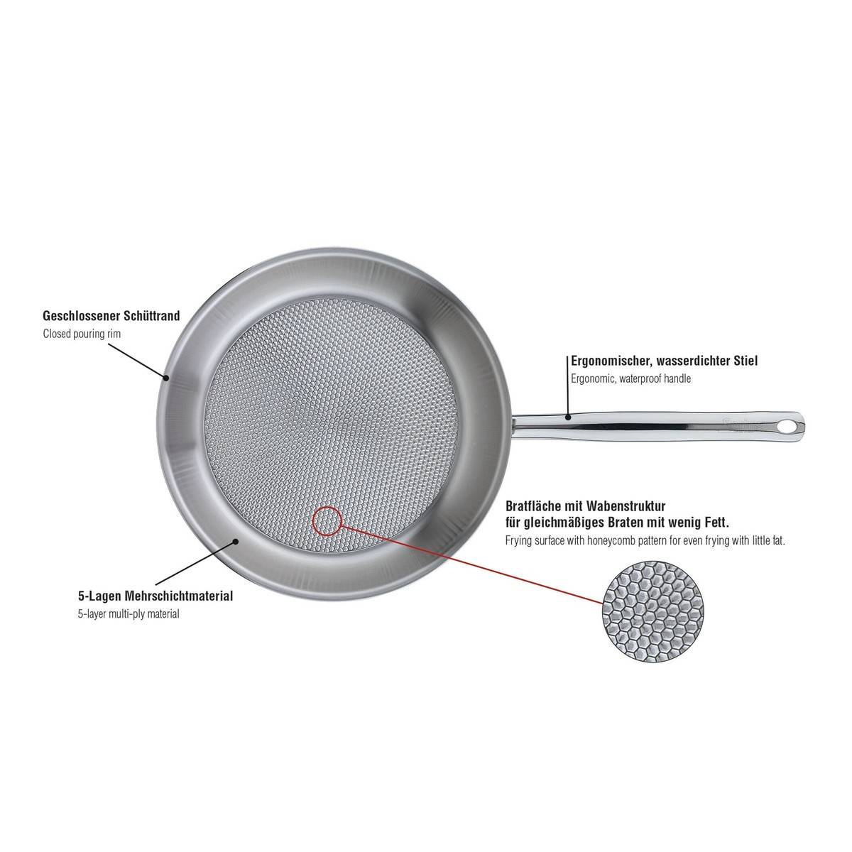 - Vyrobeno z 5vrstvého materiálu: vnější vrstva z indukčně vhodné nerezové oceli 18/0, vnitřní vrstva z nerezové oceli 18/10 a trojitý hliníkový jádro