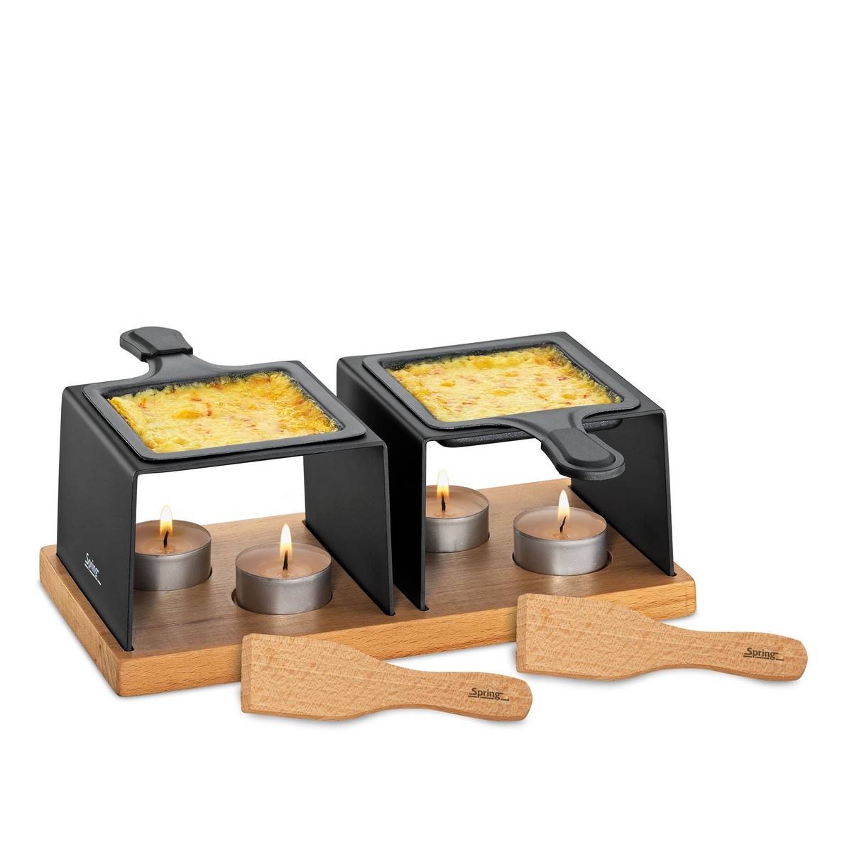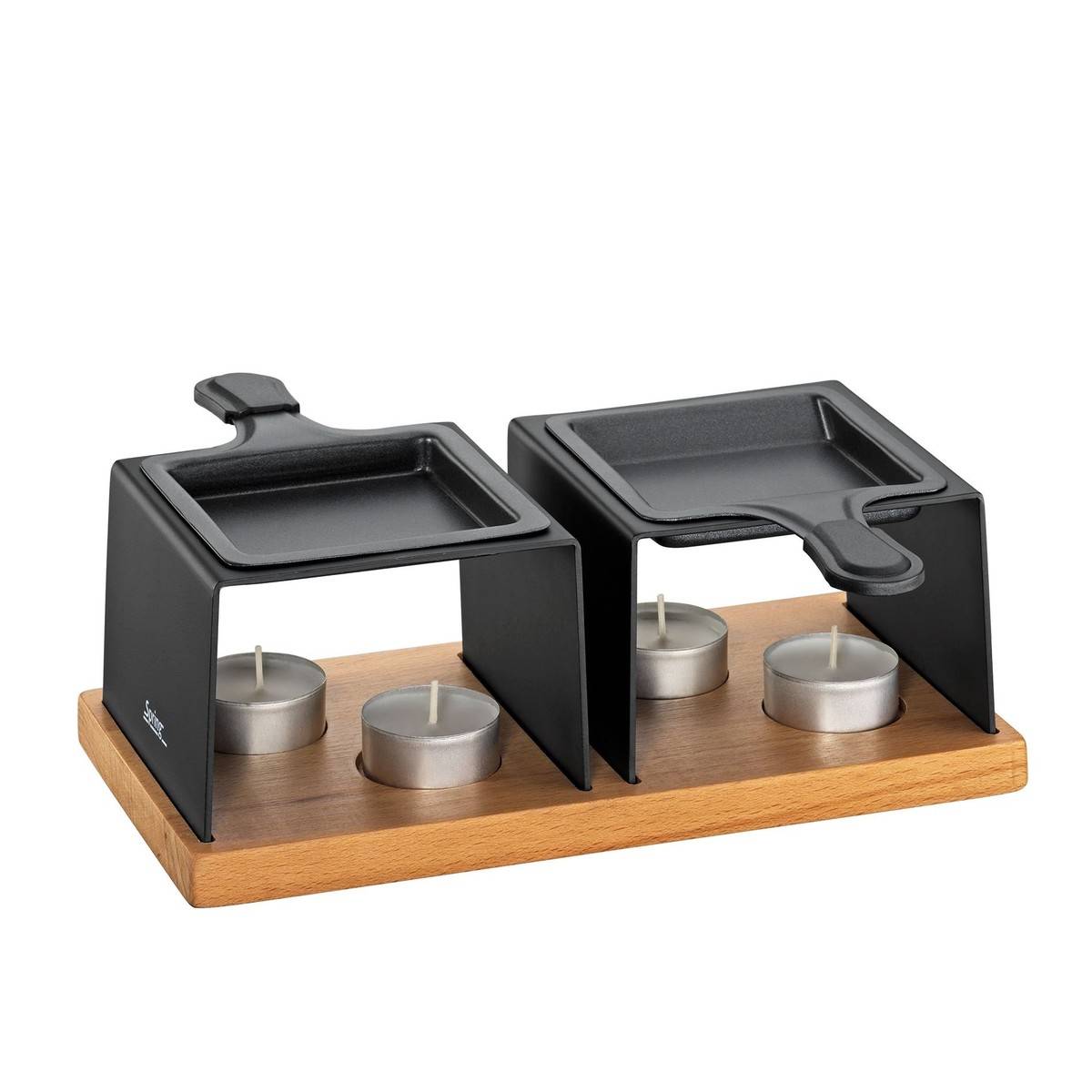 - V balení naleznete 1x raclette s podložkou z bukového dřeva, 2x pánvička, 2x špachtle z bukového dřeva, 4x čajová svíčka a návod k použití