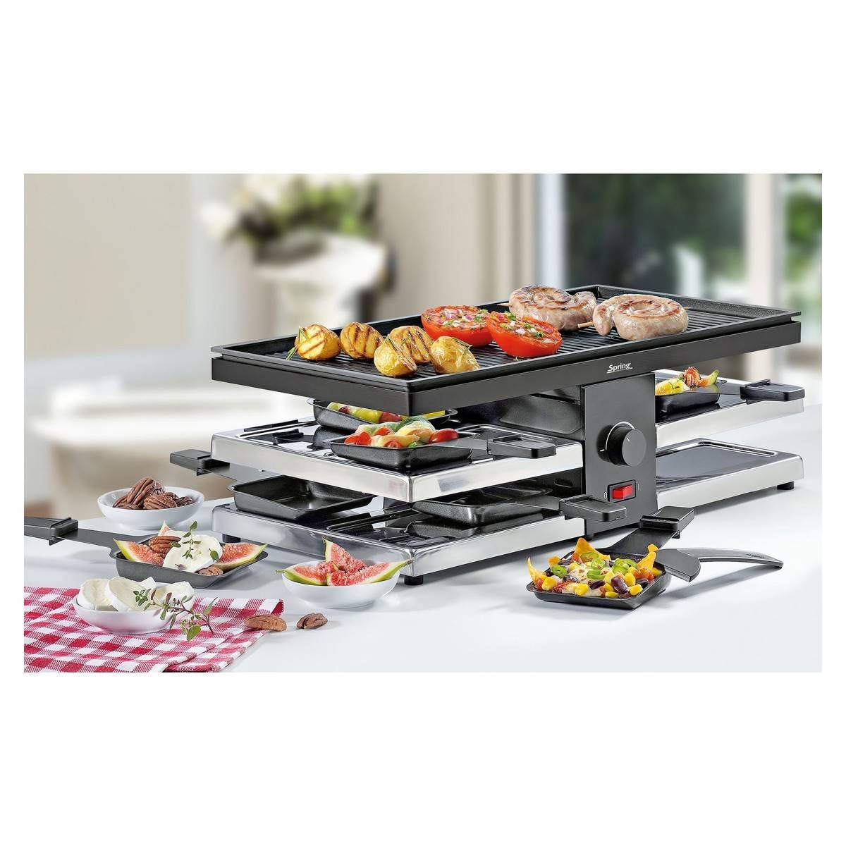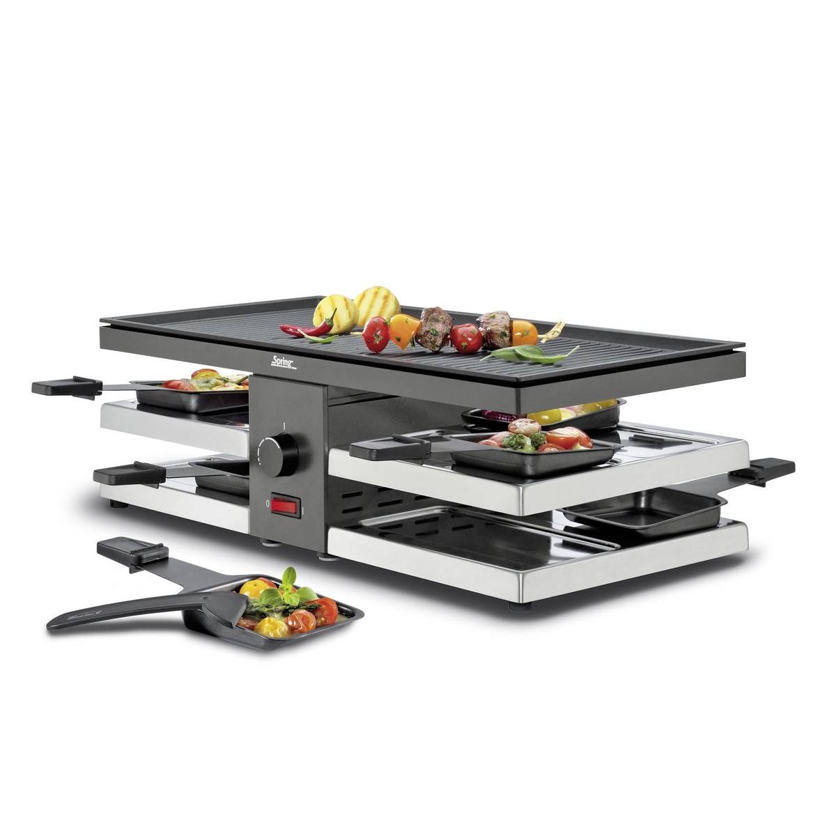 - Umožňuje přímo u stolu připravovat různé ingredience podle vlastního vkusu – v pánvičkách si zapečete oblíbená jídla se sýrem a na grilovací desce připravíte chutné grilované speciality.