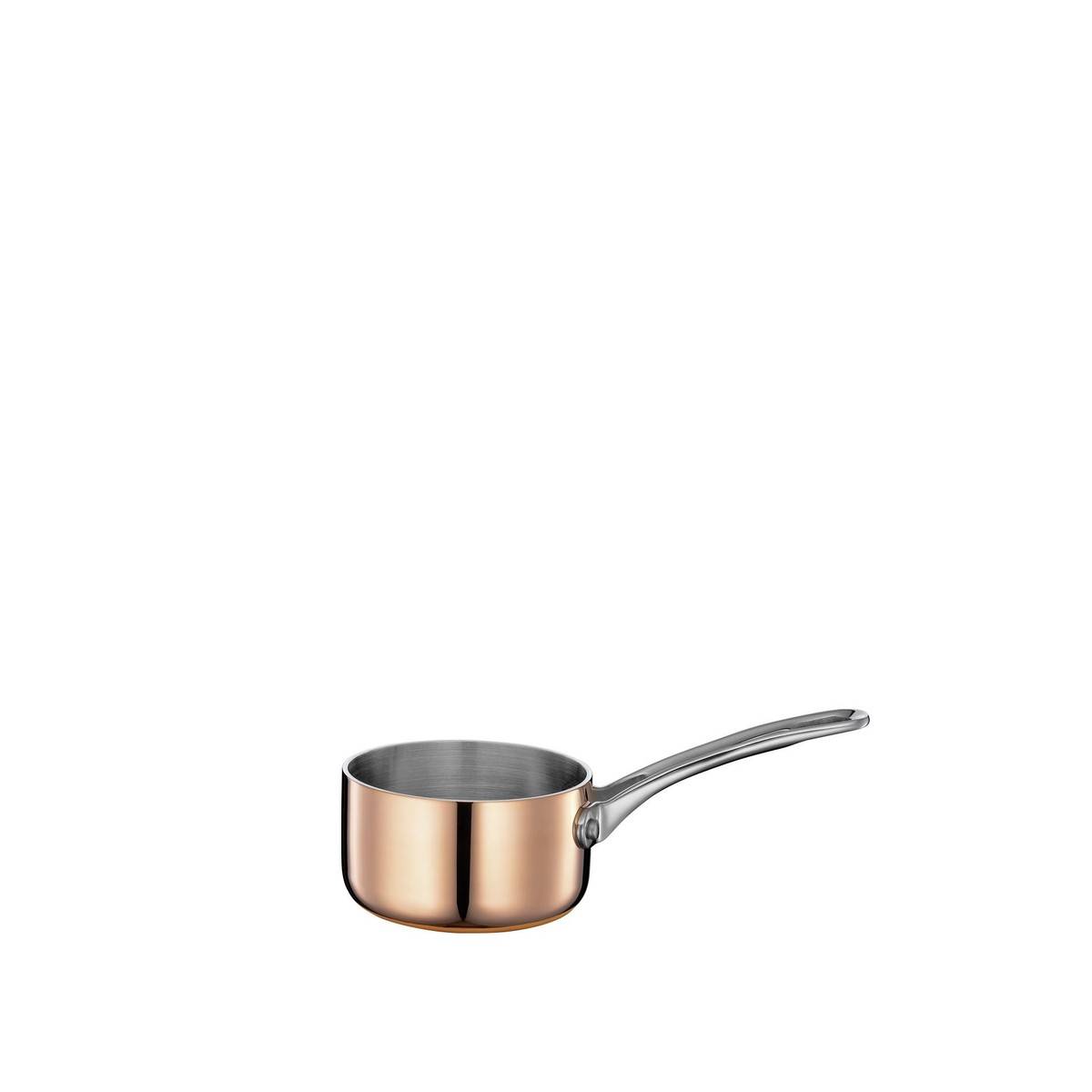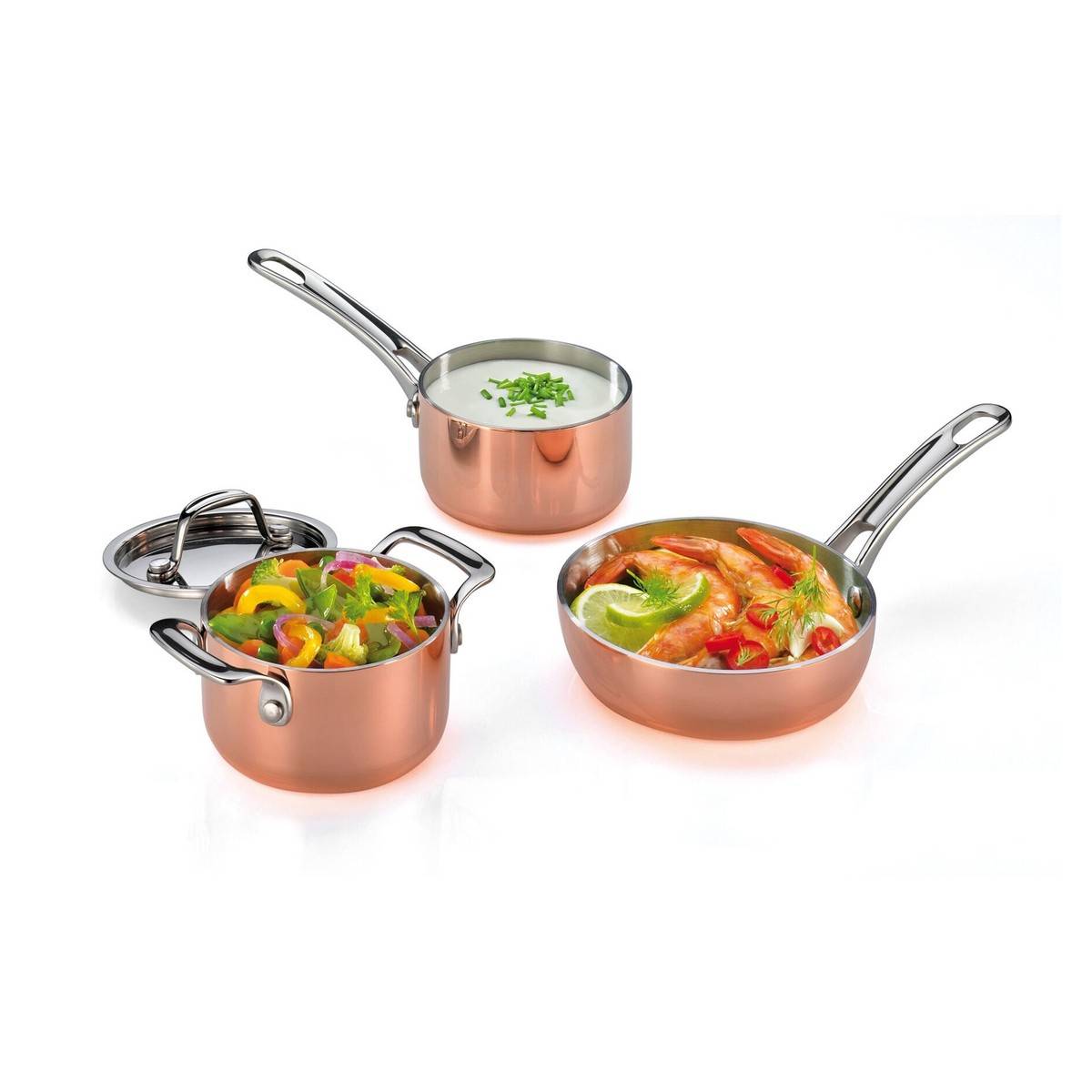 - 5vrstvé materiálové provedení: vnější vrstva z čisté mědi, vnitřní vrstva z nerezové oceli 18/10 a trojitý hliníkový jádrový systém pro optimální vedení tepla.